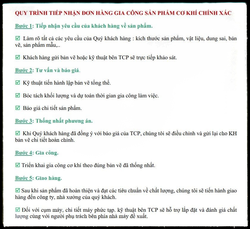 Với kinh nghiệm nhiều năm trong lĩnh vực kỹ thuật thiết bị, chi tiết máy công nghiệp, tự động hóa trong nhà xưởng. Đội ngũ nhân lực của TCP cam kết mang đến những sản phẩm cơ khí đúng tiêu chuẩn bản vẽ, gần tương đồng nhất với sản phẩm mẫu, cho hiệu quả sử dụng cao đúng như mong đợi của Quý đối tác.